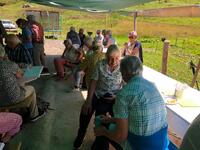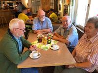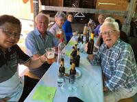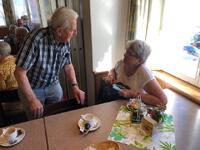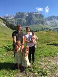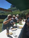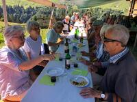 Um 12.00 Uhr hatten alle das Tagesziel erreicht, wo uns die Gastgeber-Familie von Marion und Thomas mit ihren drei Kindern freundlich begrüsste. Sie hatte uns als Dank für unsere finanzielle Unterstützung für ihr Bauvorhaben – Bau eines Zufahrtssträsschens und Vergrösserung der Jauchegrube bei ihrem «Heimetli» Obere Windegg, nicht weit von der erwähnten Alp entfernt – zu einem Mittagessen eingeladen. Der Anblick des Alpgeländes mit weidendem Vieh und der umliegenden Berge war ein Genuss; der bereitgestellt Apéro löschte den ersten Durst.